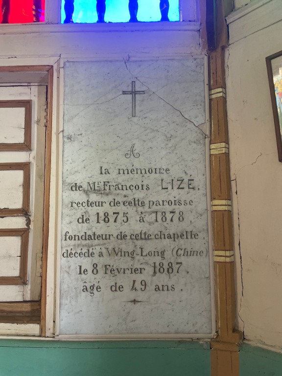 Plaque commémorative en marbre à la mémoire du fondateur de la chapelle, le recteur François LizéImmatriculation