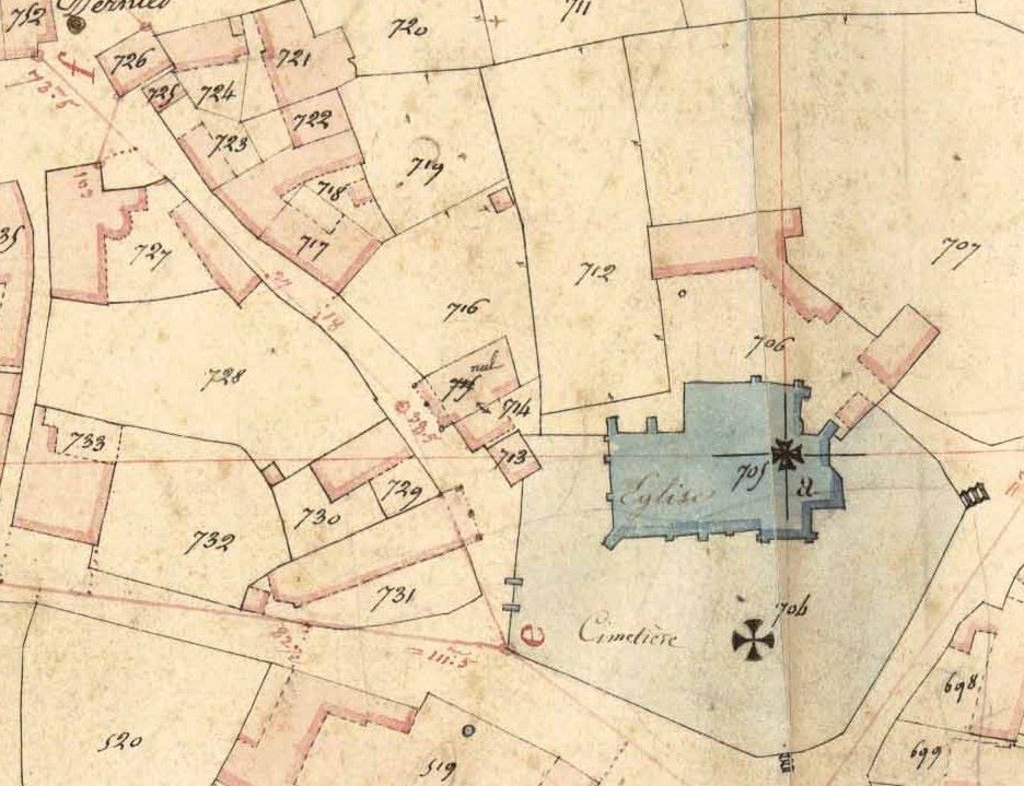 Maisons à porches subsistant au début du 19e siècle dans la rue des Dames qui relie l'église à la place des halles.Immatriculation