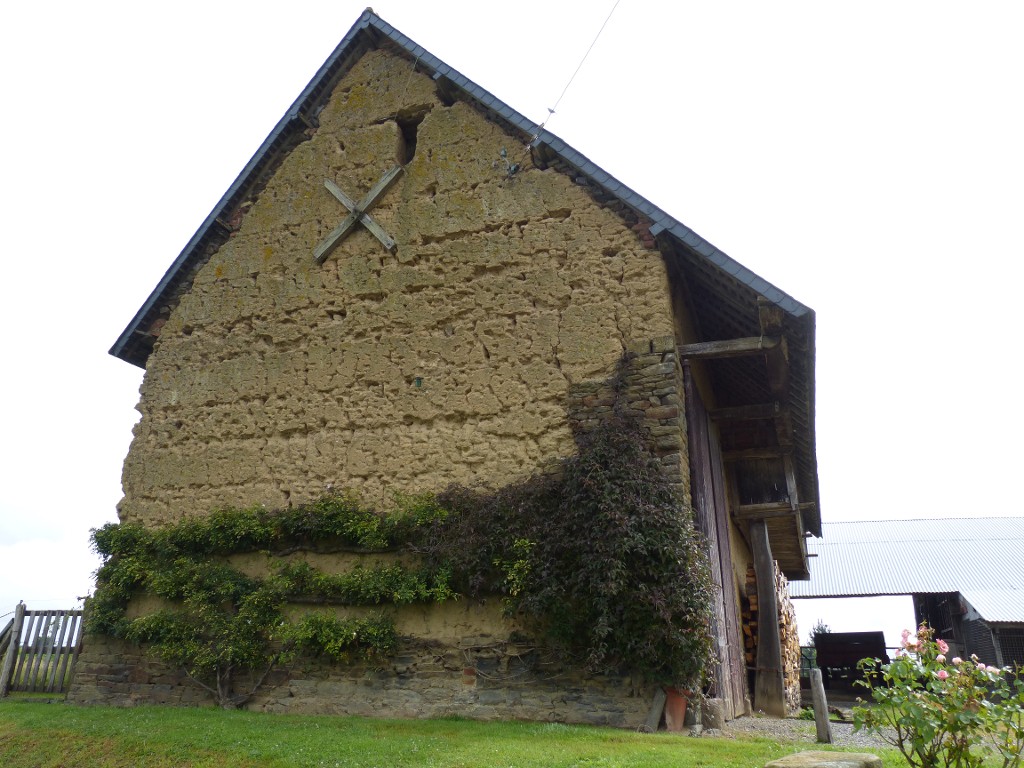 Vue du pignon ouest de la grange, maçonnerie mixte en schiste et terre, détail de l'auvent sur la façade principaleImmatriculation