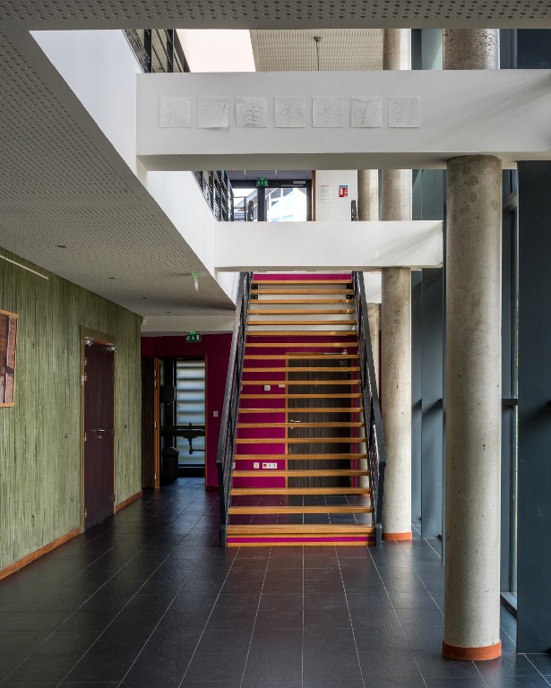 Vue intérieure de "l'amphithéâtre" : dégagement vitré et cage d'escalier. Agence LBL (L'Hyver-Brechet-Lohé), 2010.Immatriculation