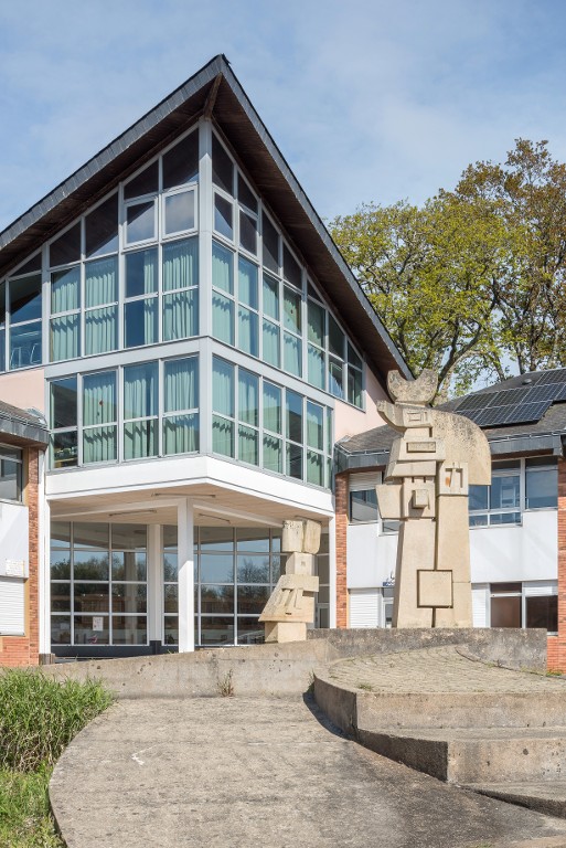 Elévation du hall-entrée et CDI, prise du sud-est. Patrick Pincemaille et Ruelland-Perche-Héraud, architectes, 1986. Noter deux des trois "totems" de l'espace sculpté de Michel Politzer.Immatriculation