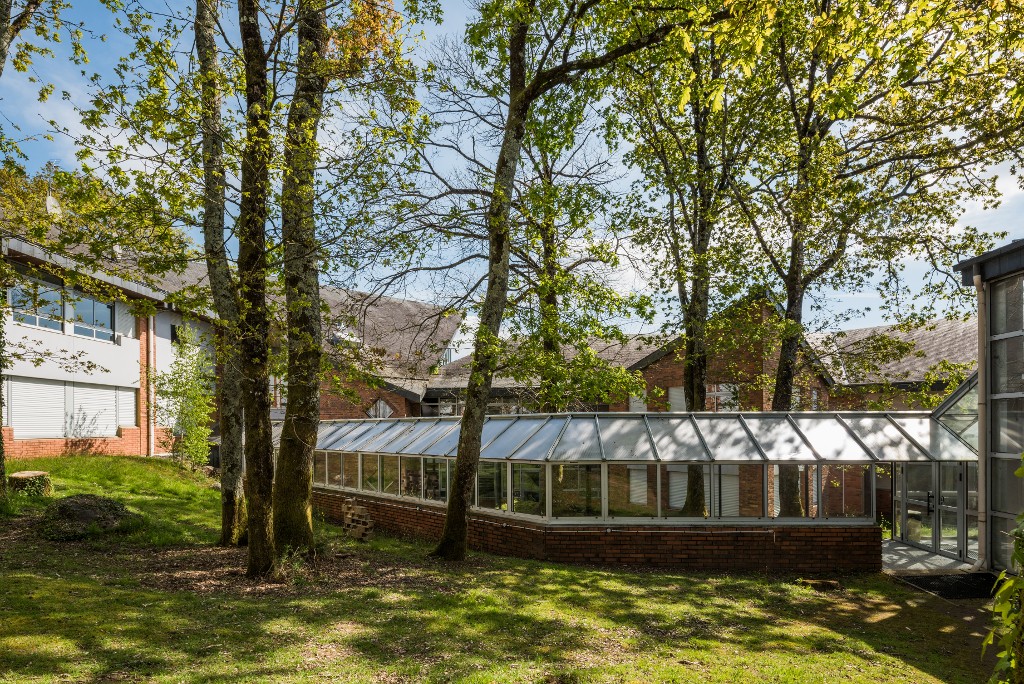 Vue d'ensemble de la cour ouest, de la façade ouest de la galerie couverte et de l'aile bleue (à l'arrière plan). Patrick Pincemaille et Ruelland-Perche-Héraud, architectes, 1986.Immatriculation