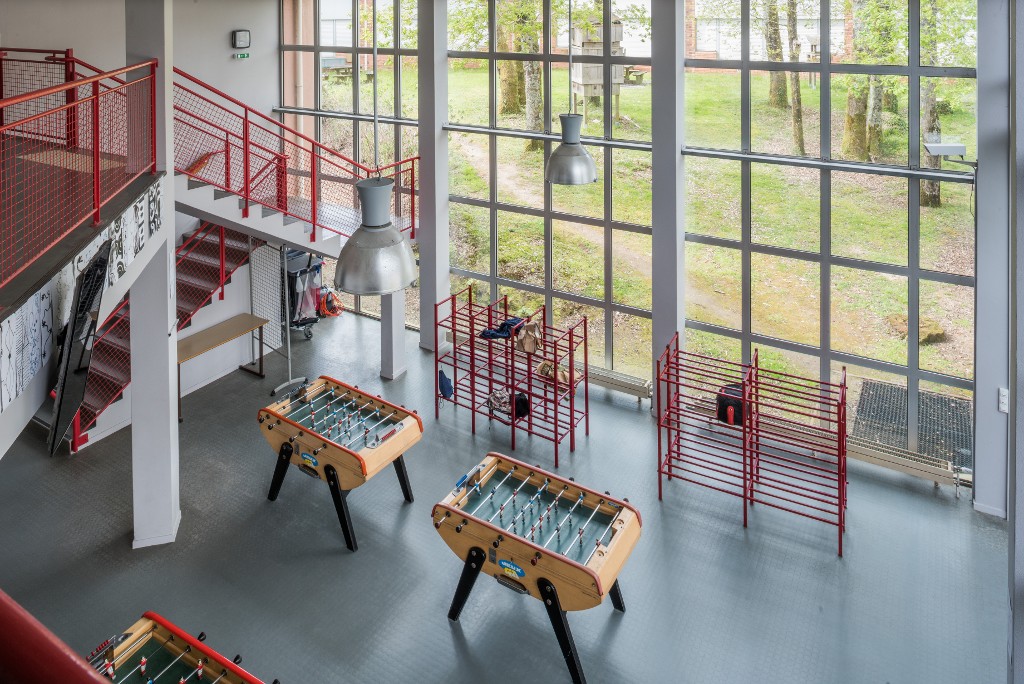 Vue du foyer des élèves en contreplongée, prise depuis une mezzanine. Noter l'ouverture de l'espace, tant par l'absence de cloison que par la transparence sur le parc. Patrick Pincemaille et Ruelland-Perche-Héraud, architectes, 1986.Immatriculation