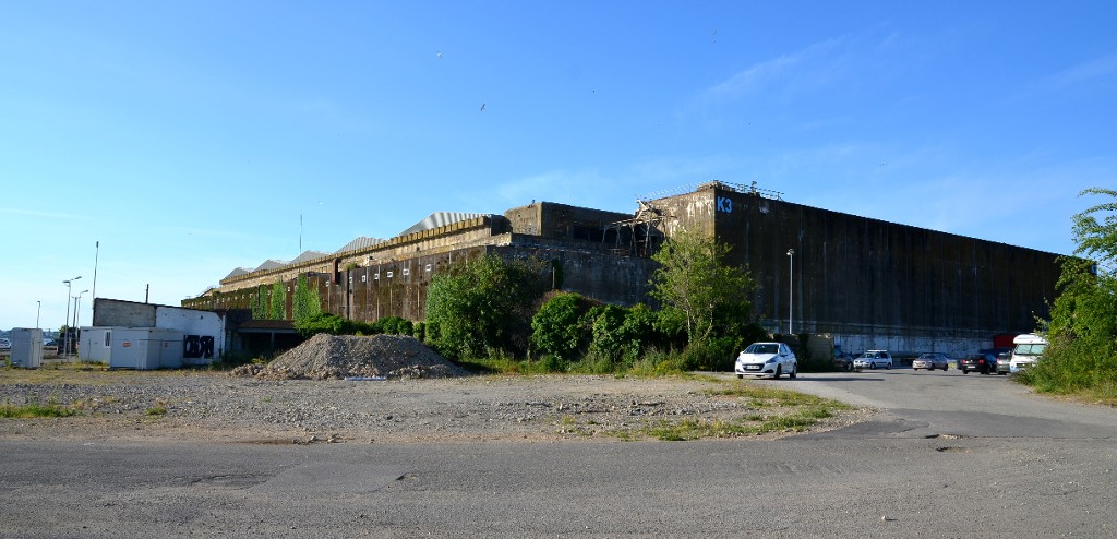 Vue générale du bunker Keroman III depuis le nord : de part et d'autre de l'angle nord, les extensions nord-est et nord-ouestImmatriculation