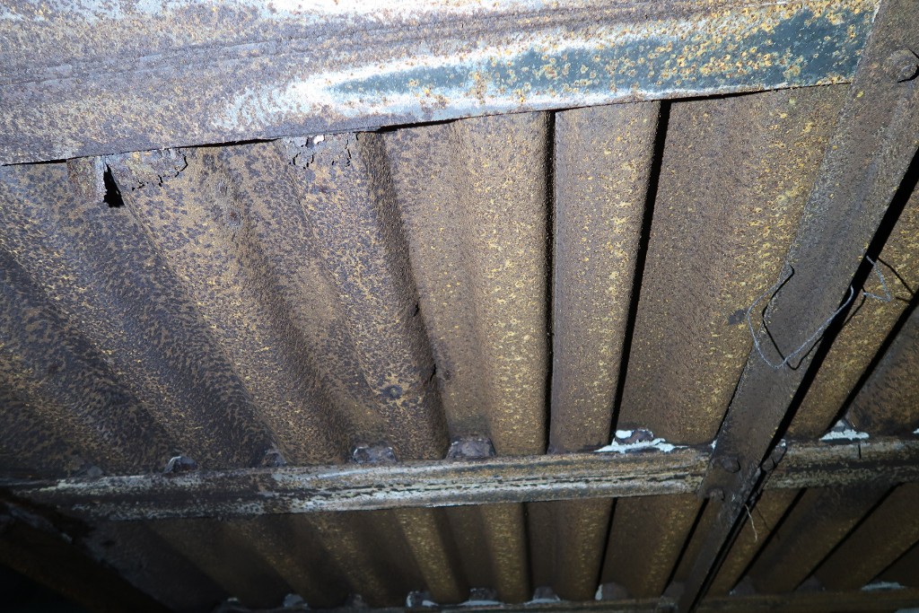Vue de l'extension nord-ouest : détail du dessous de la dalle de couverture du bunker Keroman III, plaques nervuréesImmatriculation