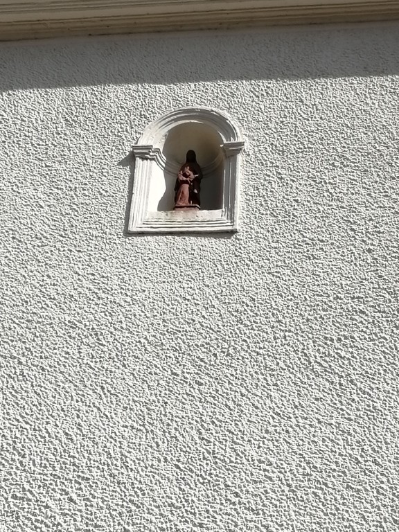 Détail d'une niche avec une sculpture d'une Vierge à l'enfant dans le mur gouttereauImmatriculation