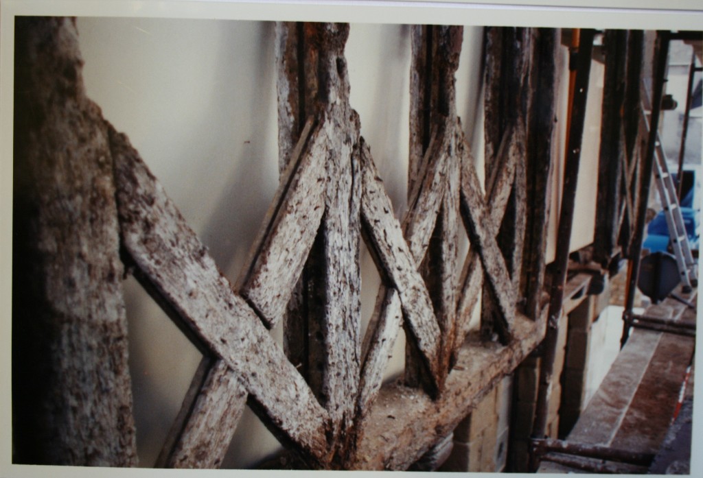 Croix de Saint-André servant d'allèges aux fenêtres. On distingue des rainures sur les poteaux, côté intérieur : trace d'anciens volets coulissants ?Immatriculation