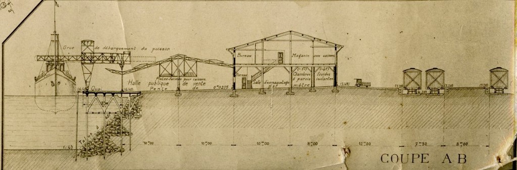 Projet du port de Keroman (1919) : coupe de la criée, depuis le quai jusqu'à la gare à maréeImmatriculation