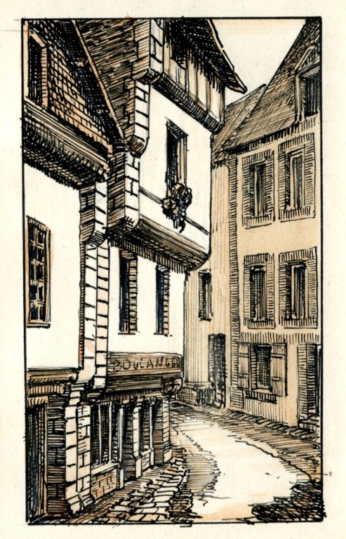 Dessin de Gaston Demoulin représentant les deux maisons en pan de bois. Celle de droite est aujourd'hui détruite.Immatriculation