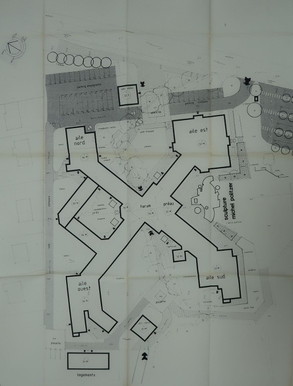 Plan masse. Espaces verts. Sculpture. Patrick Pincemaille, architecte, vers 1986.Immatriculation