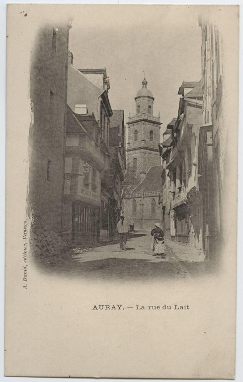 Rue du Lait : passants en costume dans la rue du Lait qui débouche sur la place de l'église.Immatriculation
