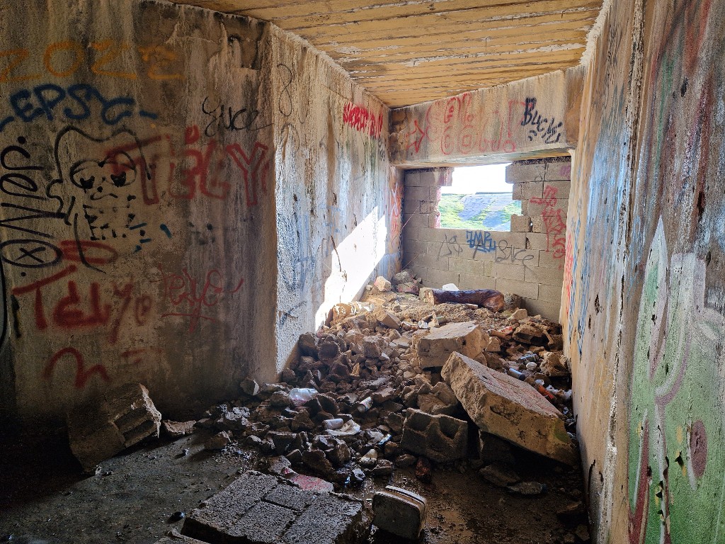 Vue intérieure du bunker - cuve nord pour canon de 34 cm avec magasins de munitions : l'une des deux entrées. Les parpaings sont cassésImmatriculation