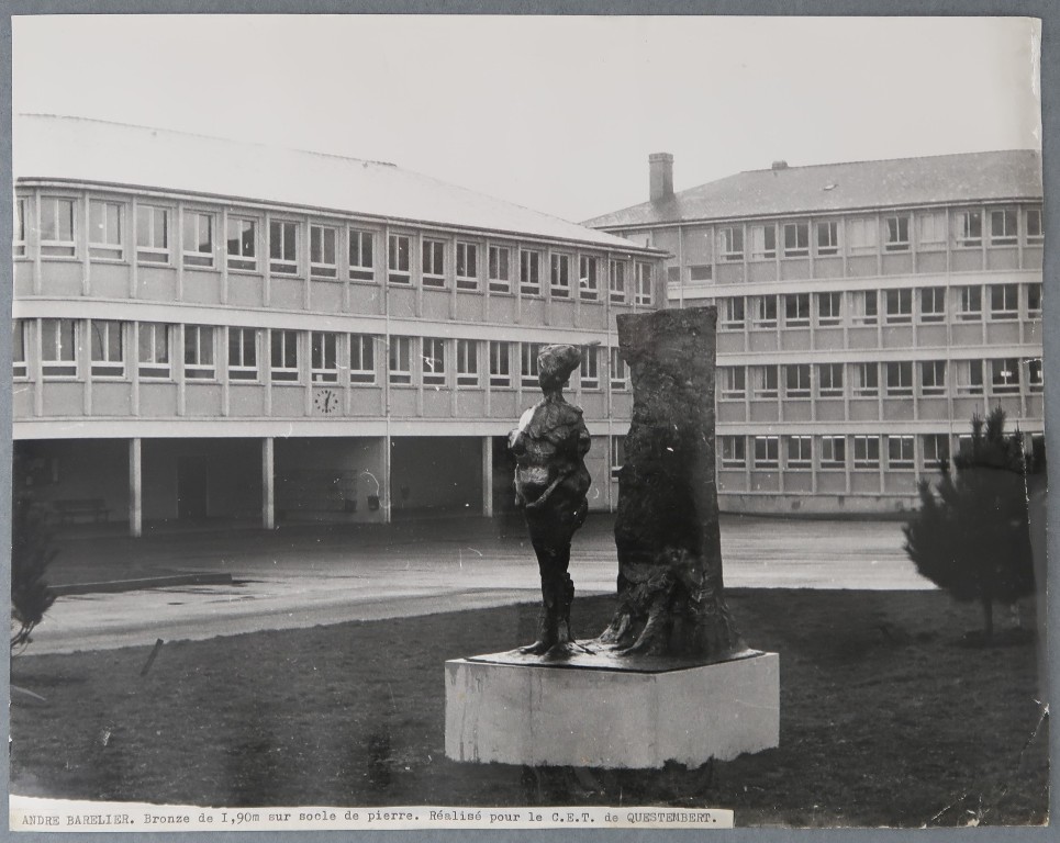 André Barelier : 'Bronze de 1,9 m sur socle de pierre'. Photographie de la sculpture peu après son installation (vers 1968).Immatriculation