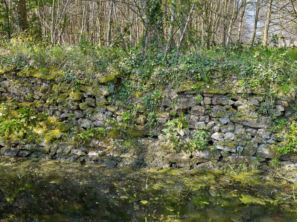Canal d'alimentation des douves, vue rapprochée du mur en pierres sèchesImmatriculation
