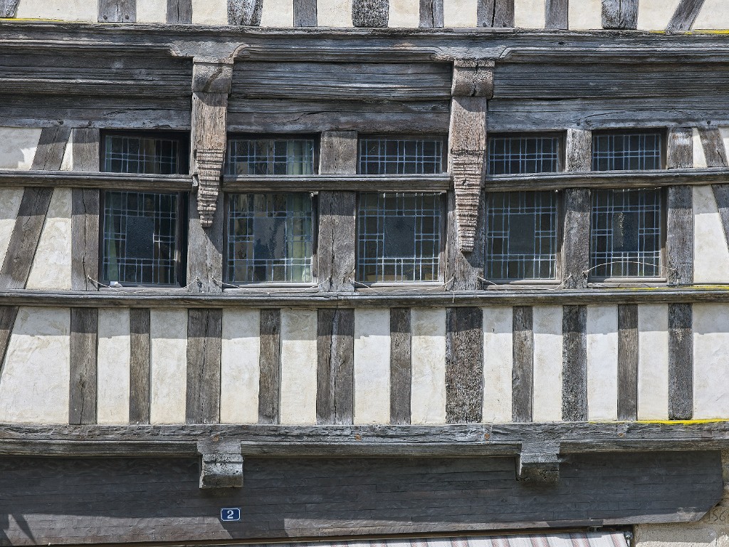 Rue aux Toiles, une rangée de petites fenêtres à impostes est restituée dans ce pan de bois restauré au 20e siècle.Immatriculation