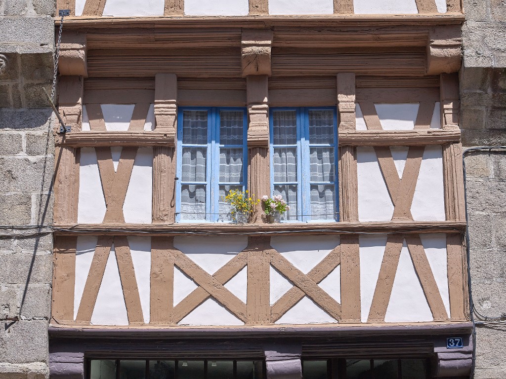 Les poteaux divisent l'étage en quatre travées : des fenêtres occupent les deux travées centrales, contreventées de chaque côté par des croix de Saint-André sur toute la hauteur du niveau.Immatriculation