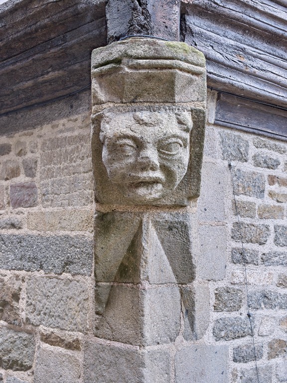Visage sculpté sur l'imposant culot en pierre qui reçoit la solive d'enrayure à l'angle des deux façades en pan de bois.Immatriculation