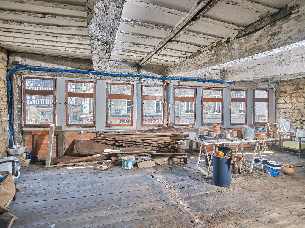 Façade en pan de bois vue de l'intérieur. Au milieu du plafond, il reste la pièce de bois dans laquelle s'ancraient les poteaux de la cloison.Immatriculation