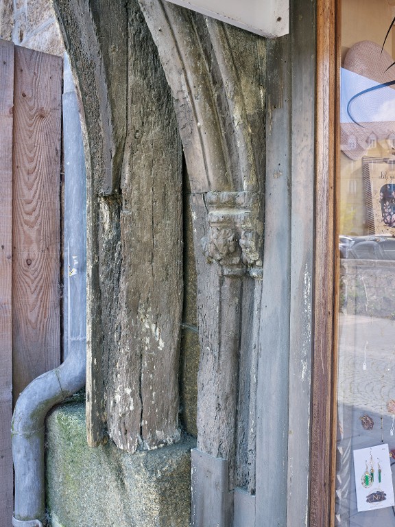 Deux poteaux soutenant la solive de rive gauche au rez-de-chaussée. Décor de moulure et feuillage.Immatriculation