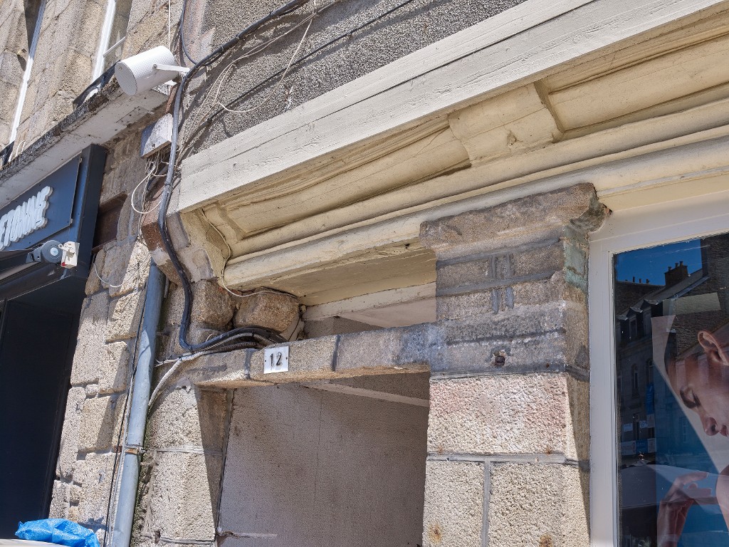 Porte d'entrée à gauche avec imposte. La maçonnerie soutient l'encorbellement.Immatriculation