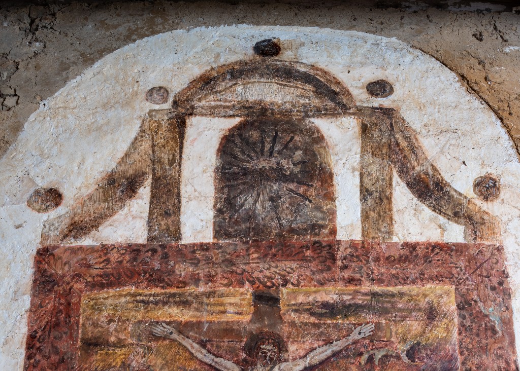 Peinture murale, panneau encadré de motifs en volute et couronné d'un fronton cintréImmatriculation