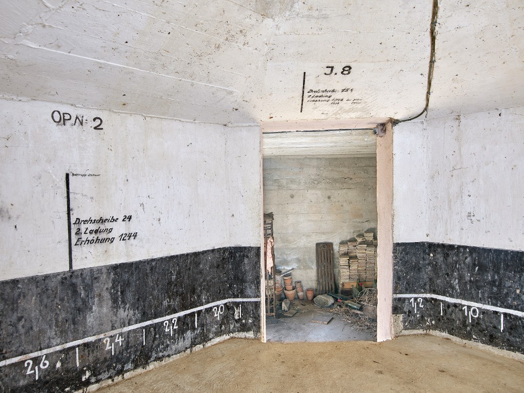 Vue intérieure : panorama avec points de repères et instructions de tir. La porte est orientée vers l'ouestImmatriculation