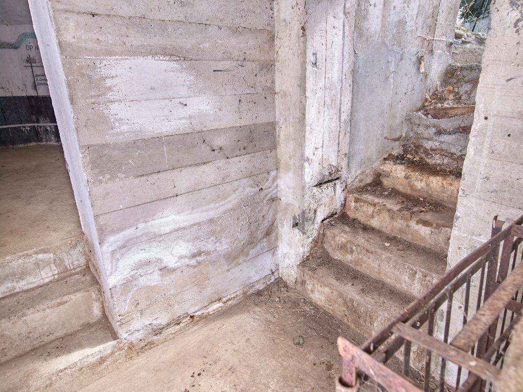 Vue intérieure : chambre d'abri faisant vestibule et magasin à munitions. Au niveau du passage de la porte se trouve un marquage : lettre JImmatriculation