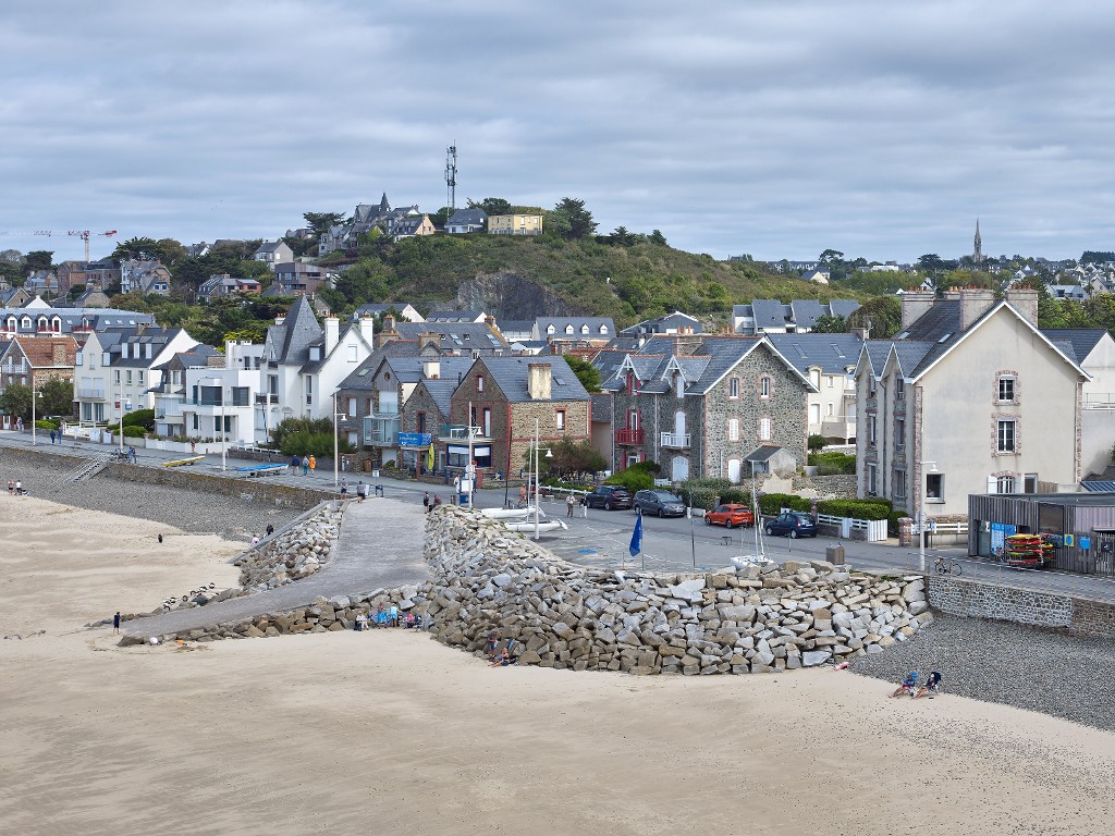 Vue du panorama depuis la pointe de la Guette : Pléneuf-Val-André. Au premier plan, la plage du Val-André. Sur ce point haut, une demeure dotée d'une tour a servi de point de repère durant la Seconde Guerre mondialeImmatriculation