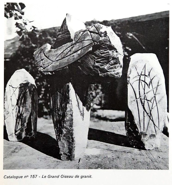 'Le Grand Oiseau de Granit', groupe sculpté d'Henri-Georges Adam. 3 X 0,8 m. Présenté à l'xtérieur du Palais de Tokyo lors de l'exposition consacré à l'artiste, en mai-juin 1966, au Musée National d'Art Moderne.Immatriculation