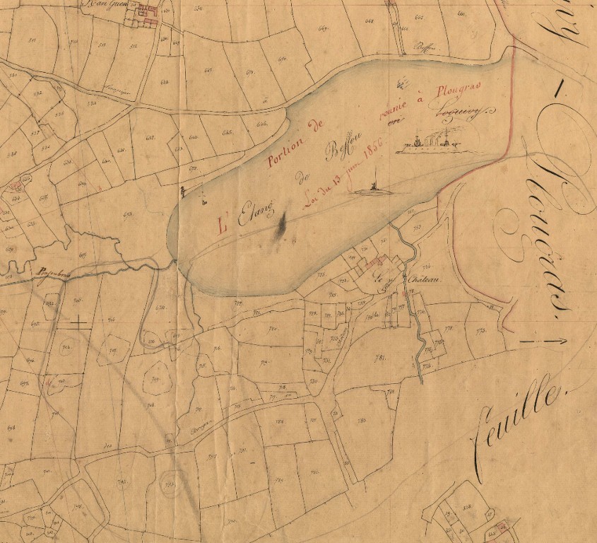 Extrait du cadastre parcellaire de la commune de Plougras, section B dite du Bourg, troisième feuille, 1834 : étang du Beffou, Le Château (lieu-dit)Immatriculation
