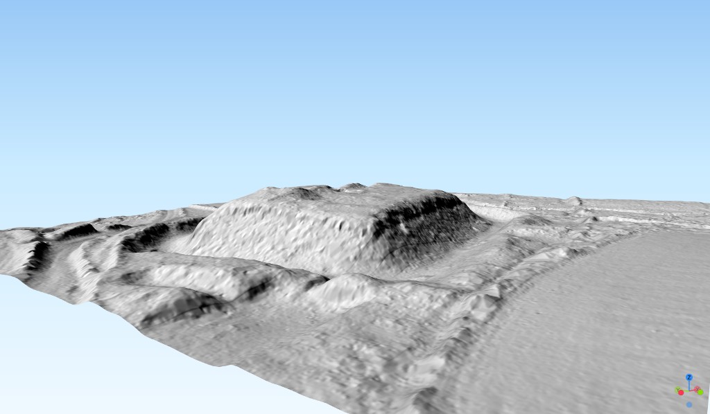 Plan en trois dimensions du château de Beffou depuis l'ouest-sud-ouest à partir du Lidar HD de l'Institut national de l'information géographique et forestière. La plate-forme surélevée du château affecte une forme trapézoïdaleImmatriculation