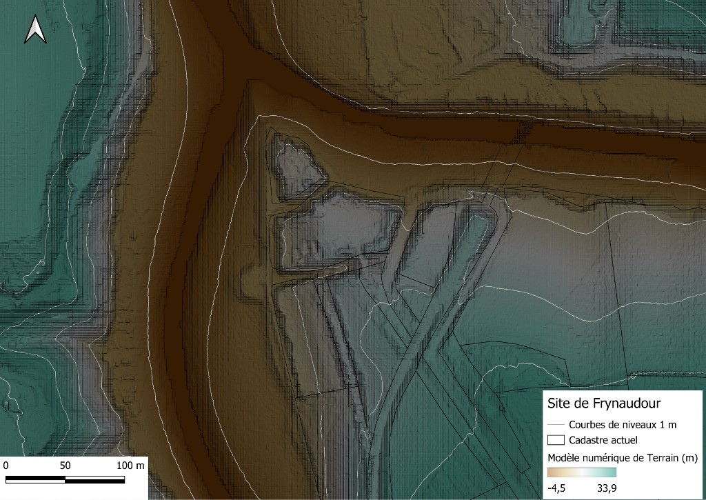Plan du site du château de Frynaudour sur fond RGE ALTI de l'Institut national de l'information géographique et forestière (rendu en modèle numérique de terrain)Immatriculation