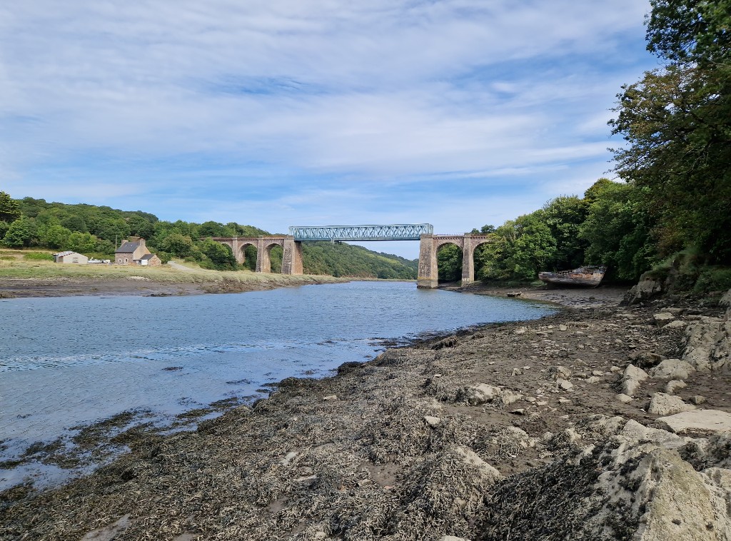 Vue du Leff depuis la berge à la confluence du Leff et du Trieux : pont ferroviaire de Frynaudour (1893). Il est surnommé viaduc du LeffImmatriculation
