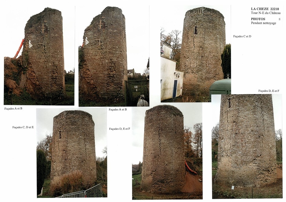 Différentes vues de la tour de plan octogonal nord-est pendant son nettoyage en 2017 (collection : Fondation La Sauvegarde de l'Art Français)Immatriculation