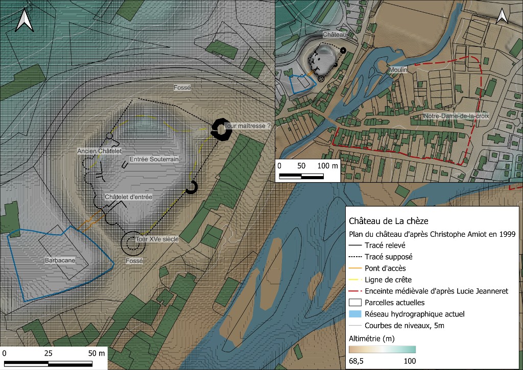 Plan du château et du bourg de La Cèze sur fond RGE ALTI de l'Institut national de l'information géographique et forestière (rendu en plan interprétatif)Immatriculation
