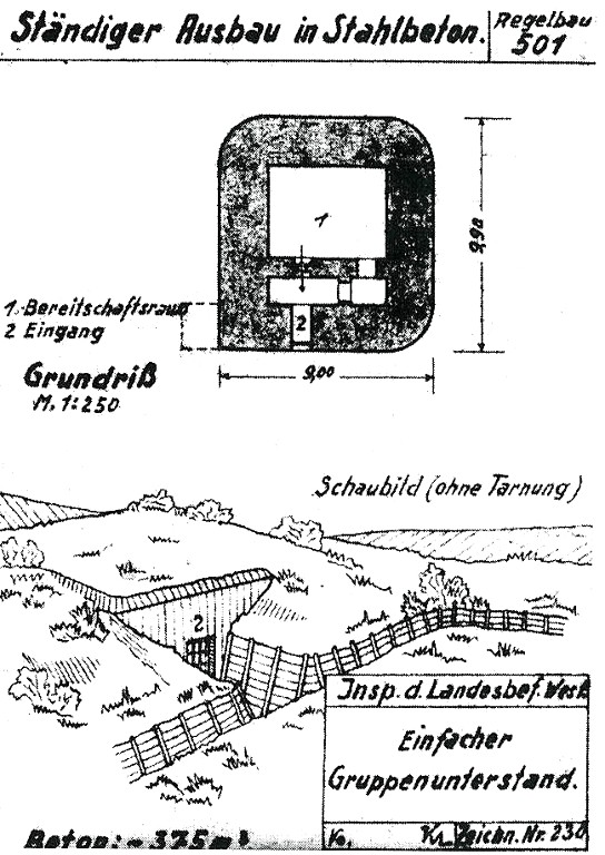 Plan d'un bunker-abri de type 501 (Ständiger Ausbau in Stahlbeton. Regelbau 501. Einfacher Gruppenunterstand)Immatriculation
