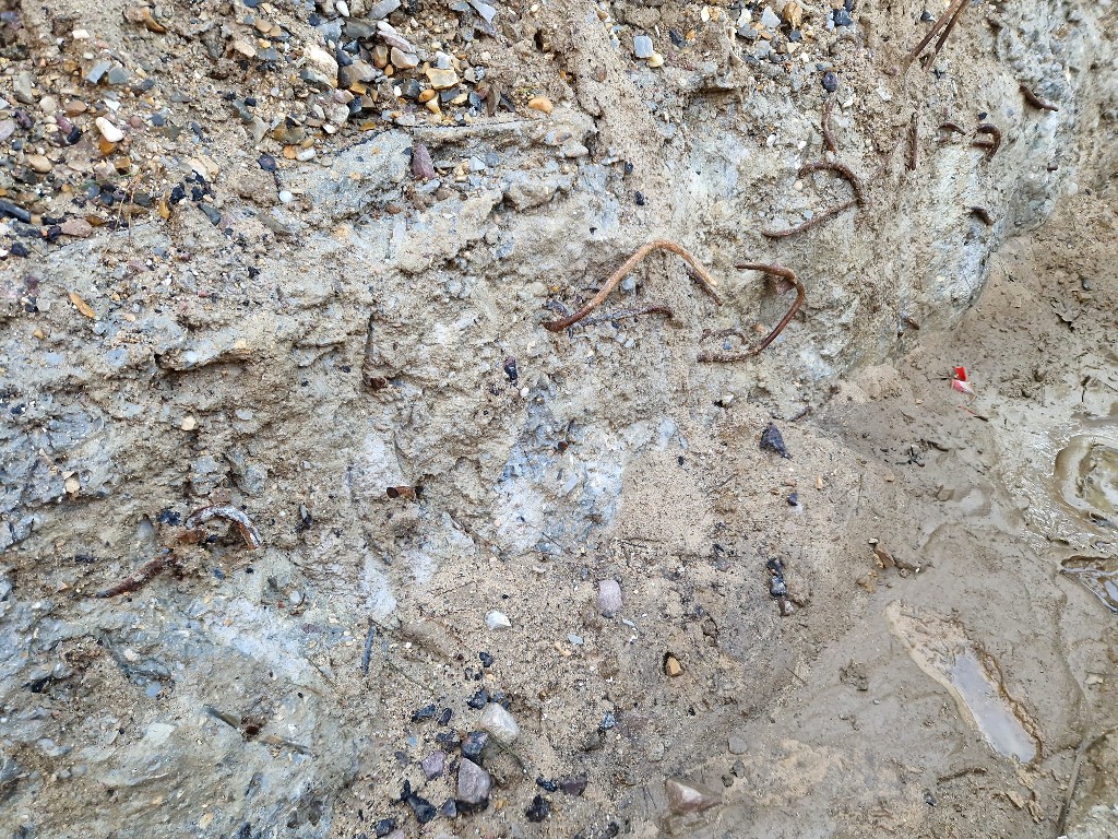 Vue de détail de la dalle de couverture : tranchée aménagée dans le béton armé pour le passage d'un tuyau d'assainissement. Les fers à béton mesurent 20 mm de diamètreImmatriculation