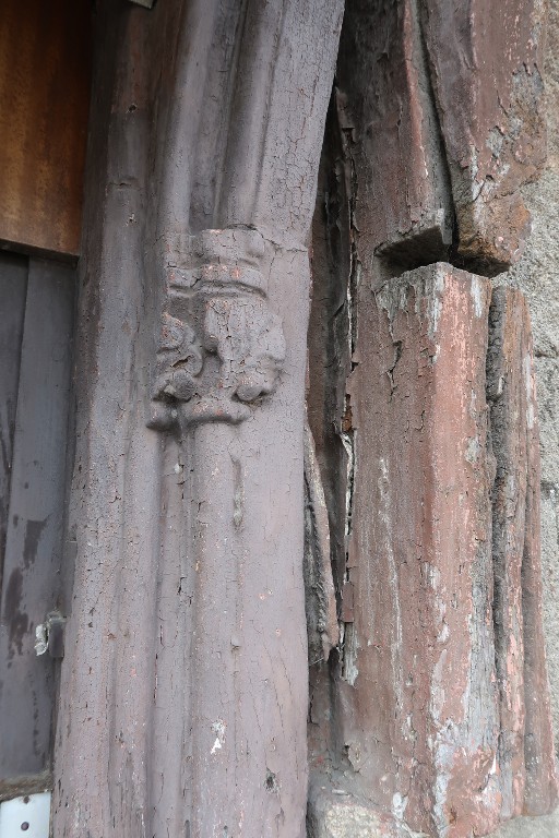 Colonnette sculptée avec motif végétal sur le poteau cornier droit du rez-de-chaussée du n°39 place du Centre.Immatriculation