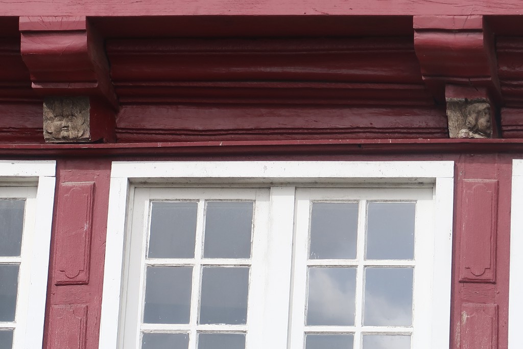 Visages sculptés à la tête des poteaux soutenant l'encorbellement du second étage.Immatriculation