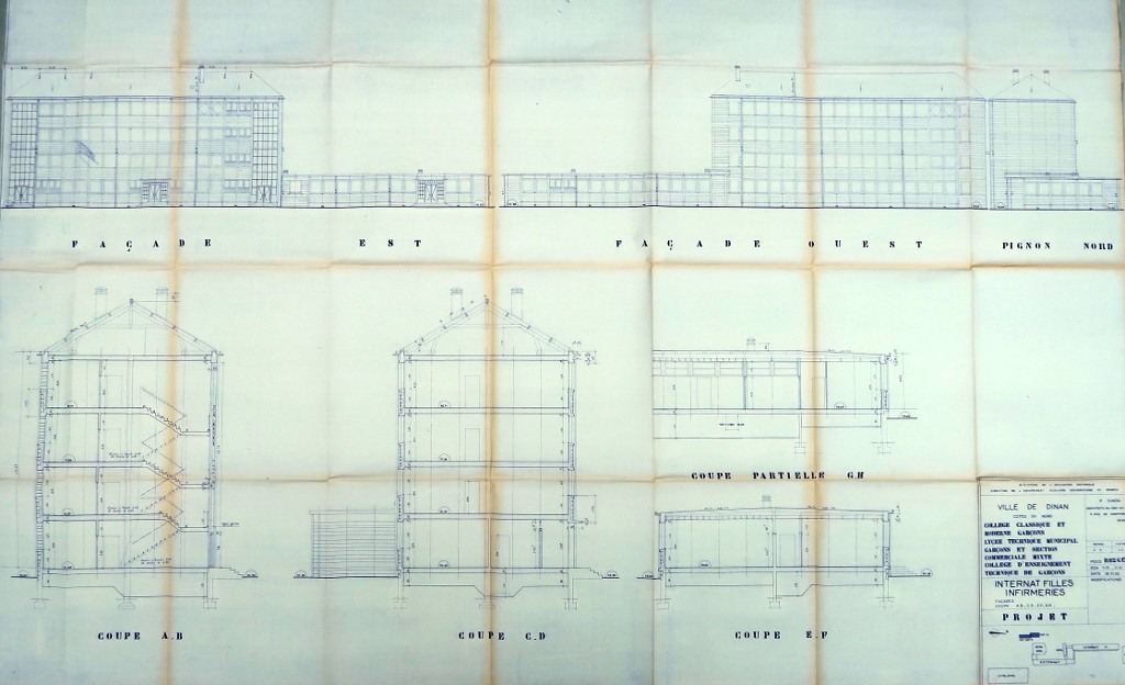 Internat de filles et infirmeries : élévations des façades et coupes. Patrice Simon, architecte, 1962.Immatriculation