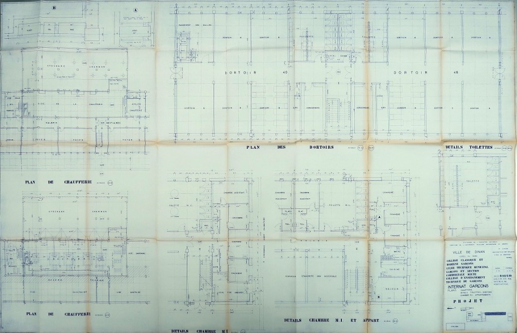 Détails de certains espaces de l'internat de garçons : dortoirs, chambre de maître d'internat, chaufferie. Patrice Simon, architecte, 1962.Immatriculation