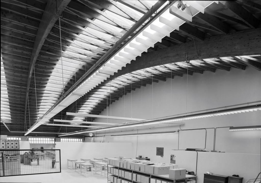 Vue intérieure partielle de la toiture des ateliers. Photographie Heurtier pour la société EGELEC, avril-mai 1967.Immatriculation