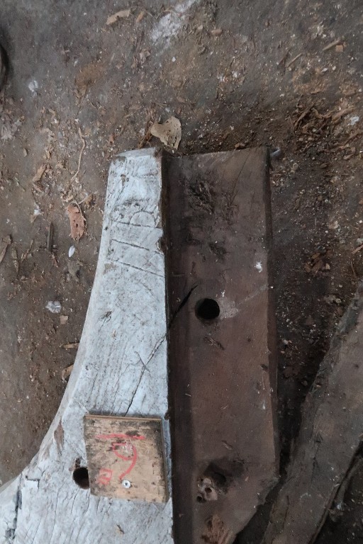 Marque de charpentier tracé à la reinette sur un élément en bois déposé après l'incendie en 2019 de la maison de Saint-Dinan.