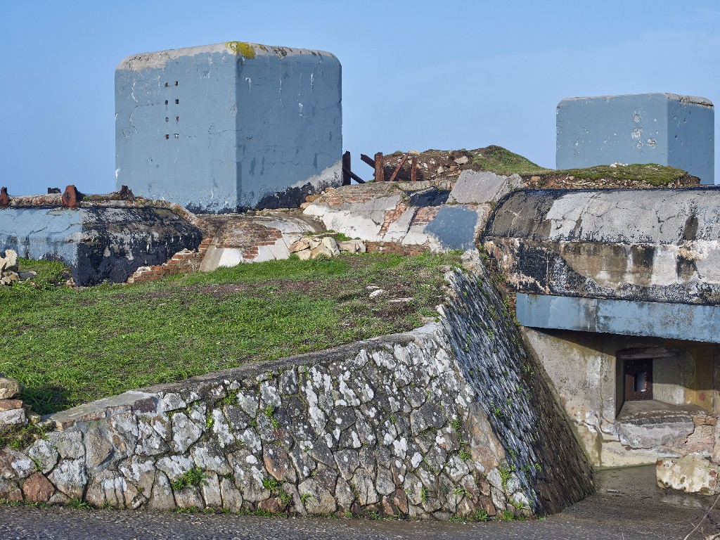Vue du bunker - abri de type 485 long pour radar Mammut depuis le sud. De la dalle de couverture émergent deux imposants puits pour câble d'antenne. Le mur en glacis de la rampe est en appareillage polygonal. En bas à droite, le créneau blindéImmatriculation