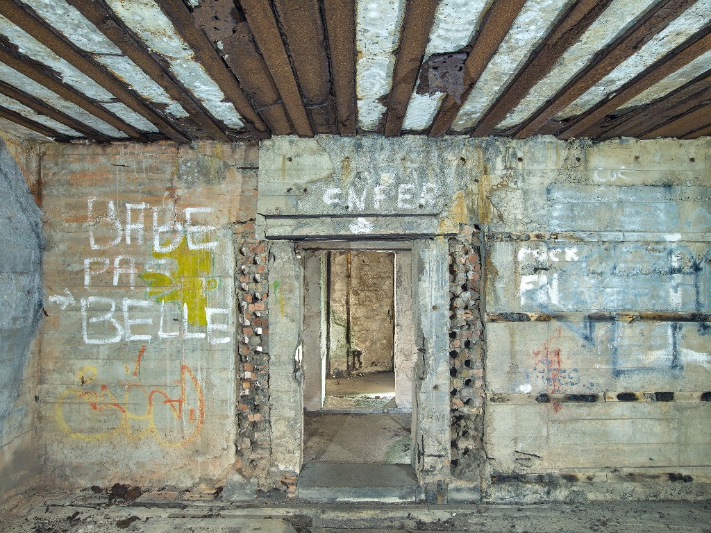 Vue du bunker - abri de type 485 long pour radar Mammut : passages de câble de la salle des compensateurs au puits d'antenne nord-est via un sas étanche. Ils sont photographiés depuis la salle des compensateurs ; au centre, porte disparueImmatriculation