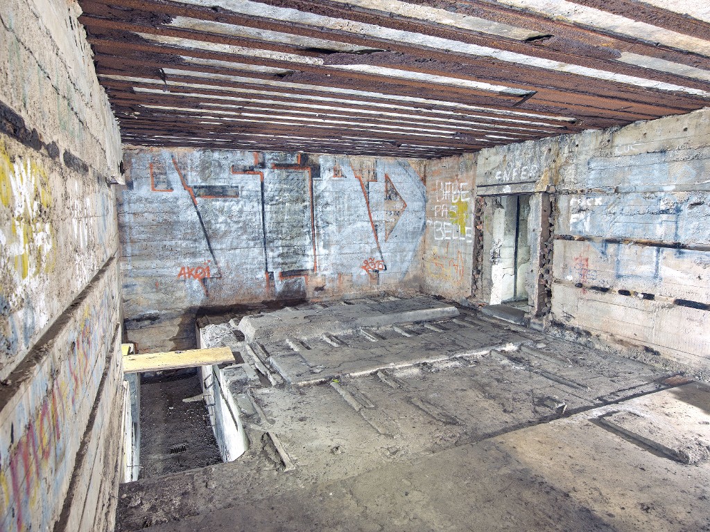 Vue du bunker - abri de type 485 long pour radar Mammut : salle des compensateurs avec sa gaine technique et ses deux socles. La salle d'exploitation et la salle des compensateurs étaient divisées par une cloison en briqueImmatriculation