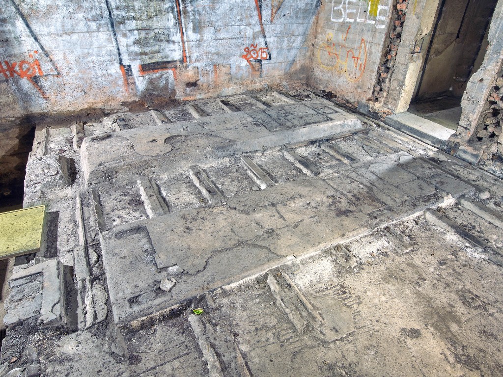 Vue des socles des compensateurs dans la salle homonyme. Des solives permettaient la fixation d'un plancher. A droite, passages de câble vers le puits d'antenne nord-estImmatriculation