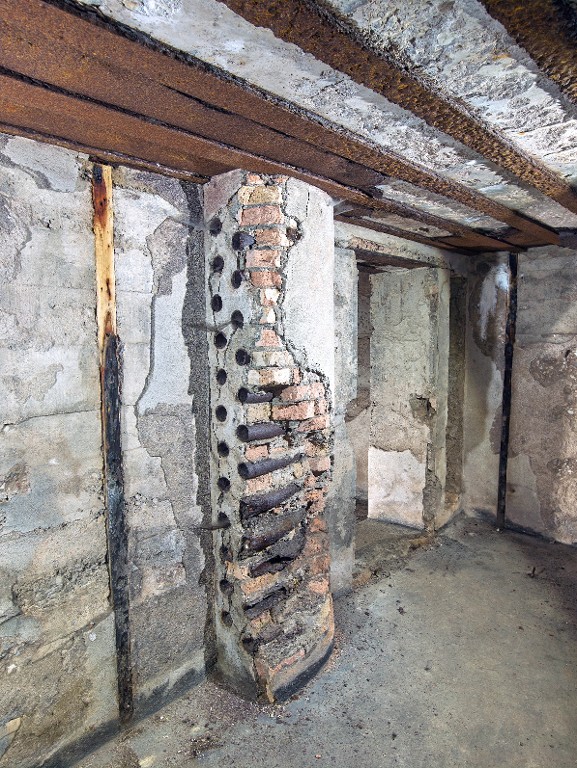 Vue du passage des câbles de la salle des compensateurs au puits d'antenne nord-est via un sas étanche. Ils sont photographiés depuis le puits. Les murs sont dotés de tasseaux posés à intervale régulierImmatriculation