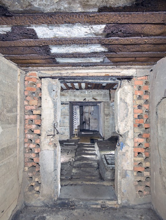 Vue du passage des câbles de la salle des compensateurs au puits d'antenne nord-est via un sas étanche. Ils sont photographiés depuis le sas étanche ; au centre, porte disparueImmatriculation