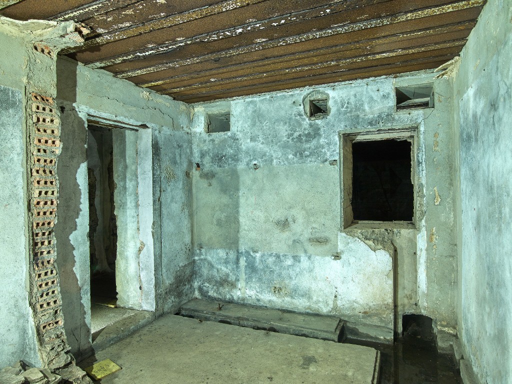 Vue de la salle des ventilateurs. Une cloison en brique creuse, percée d'une porte, subsiste à l'état de vestiges. A gauche, porte donnant sur le sas étanche. Sur le mur, traces d'un équipementImmatriculation
